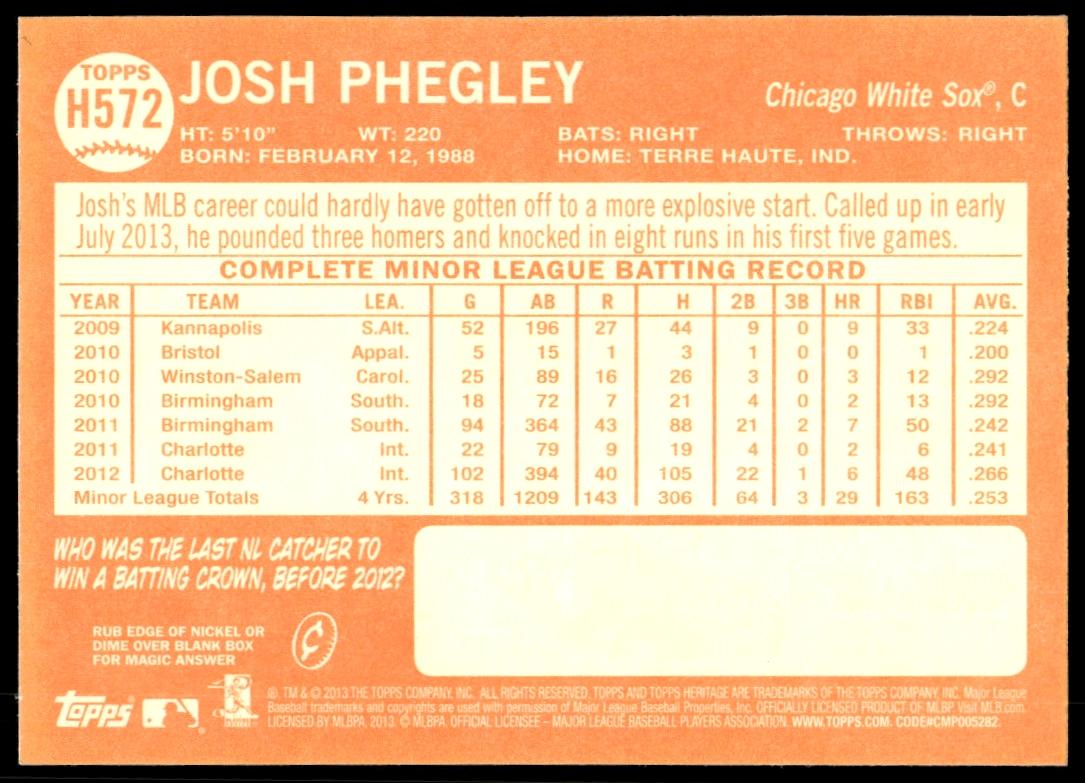 This BaseballΒ card, from 2013 is part of the Topps Heritage High NumberΒ card set. Josh Phegley is featured and has a card number of H572.