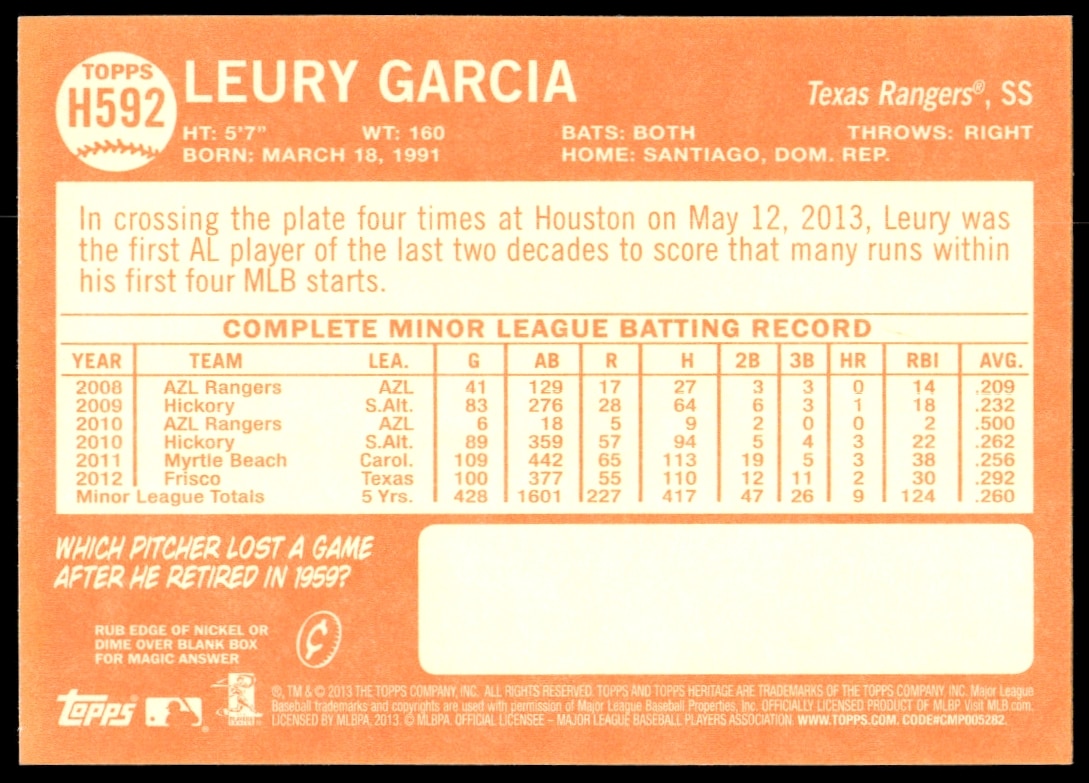 This Baseball card, from 2013 is part of the Topps Heritage High Number card set. Leury Garcia is featured and has a card number of H592.