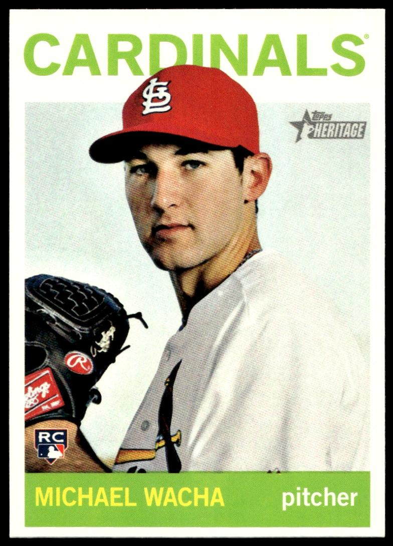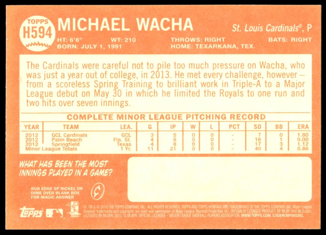 This Baseball card, from 2013 is part of the Topps Heritage High Number card set. Michael Wacha is featured and has a card number of H594.