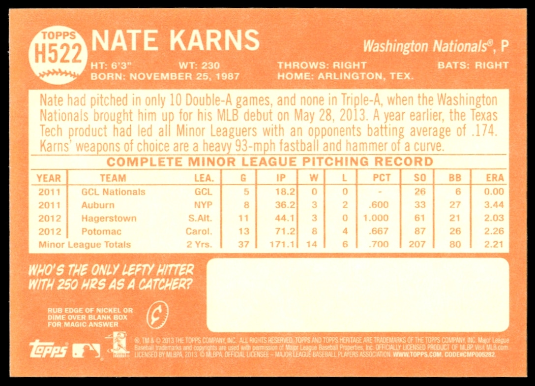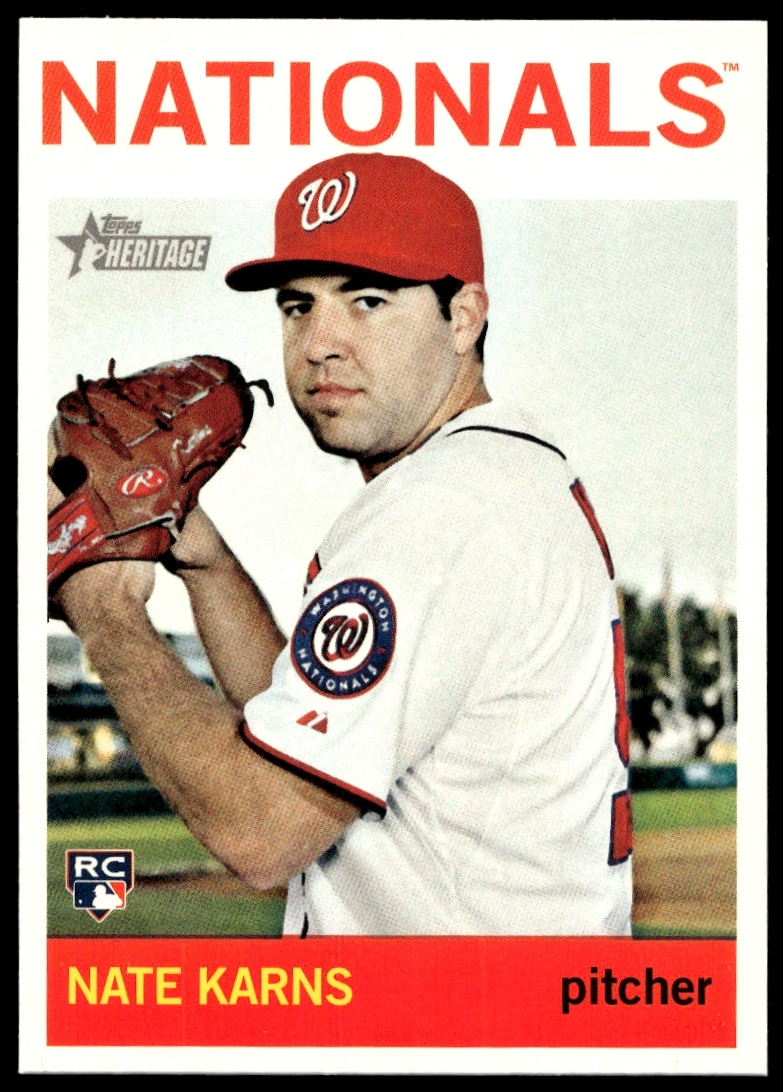 This Baseball card, from 2013 is part of the Topps Heritage High Number card set. Nate Karns is featured and has a card number of H522.