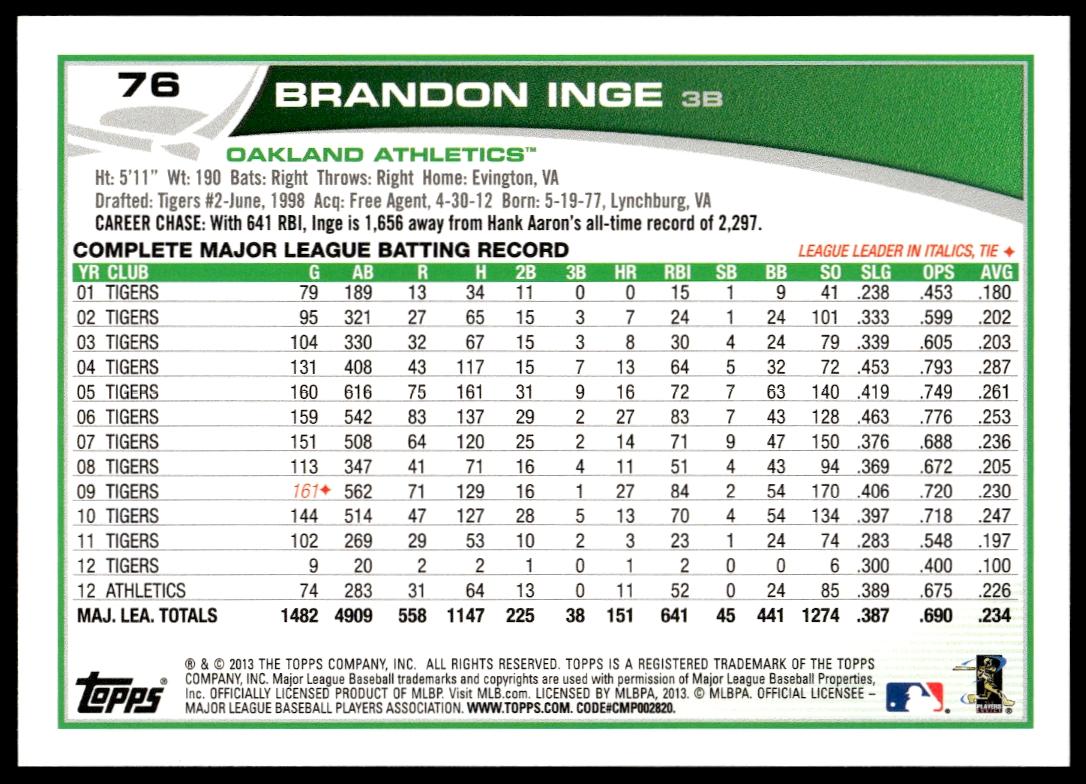 This BaseballΒ card, from 2013 is part of the Topps Series 1Β card set. Brandon Inge is featured and has a card number of 76.