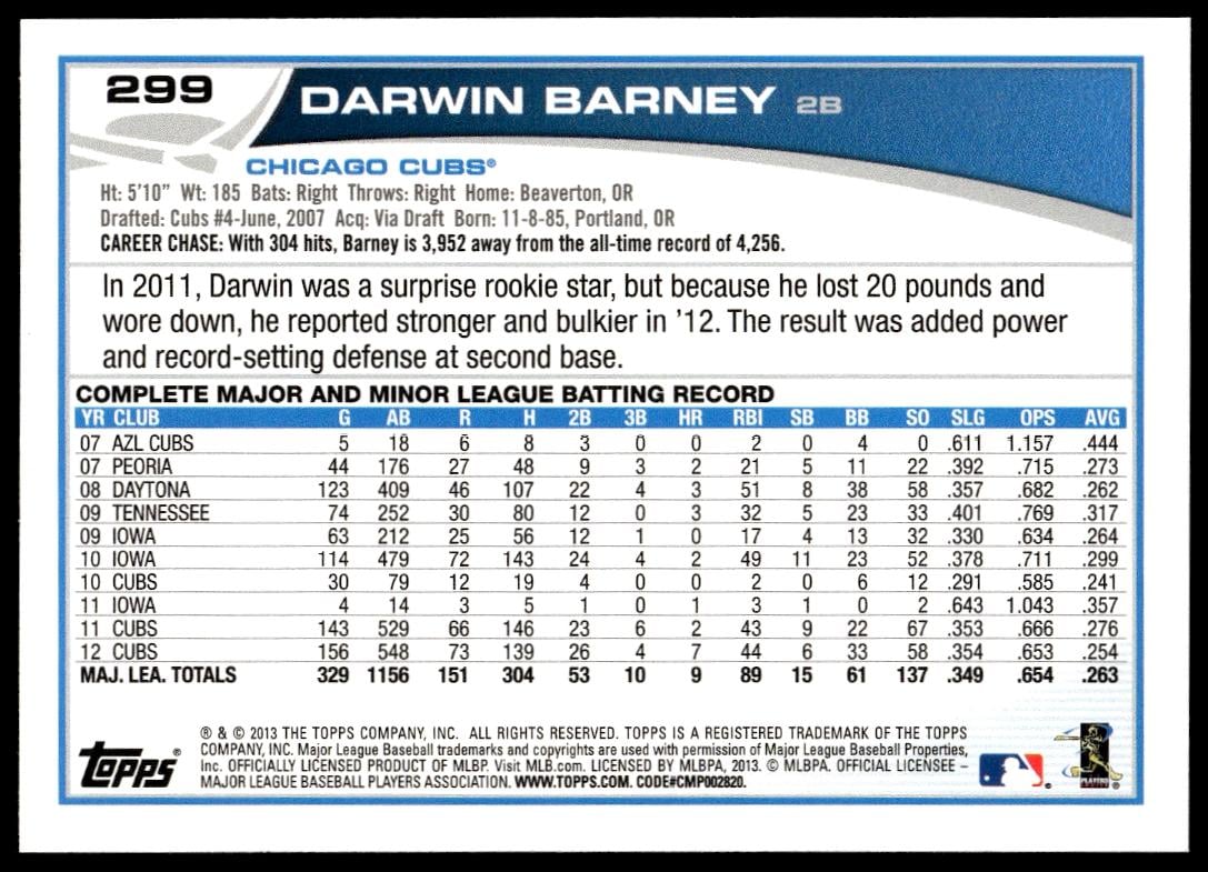 This BaseballΒ card, from 2013 is part of the Topps Series 1Β card set. Darwin Barney is featured and has a card number of 299.