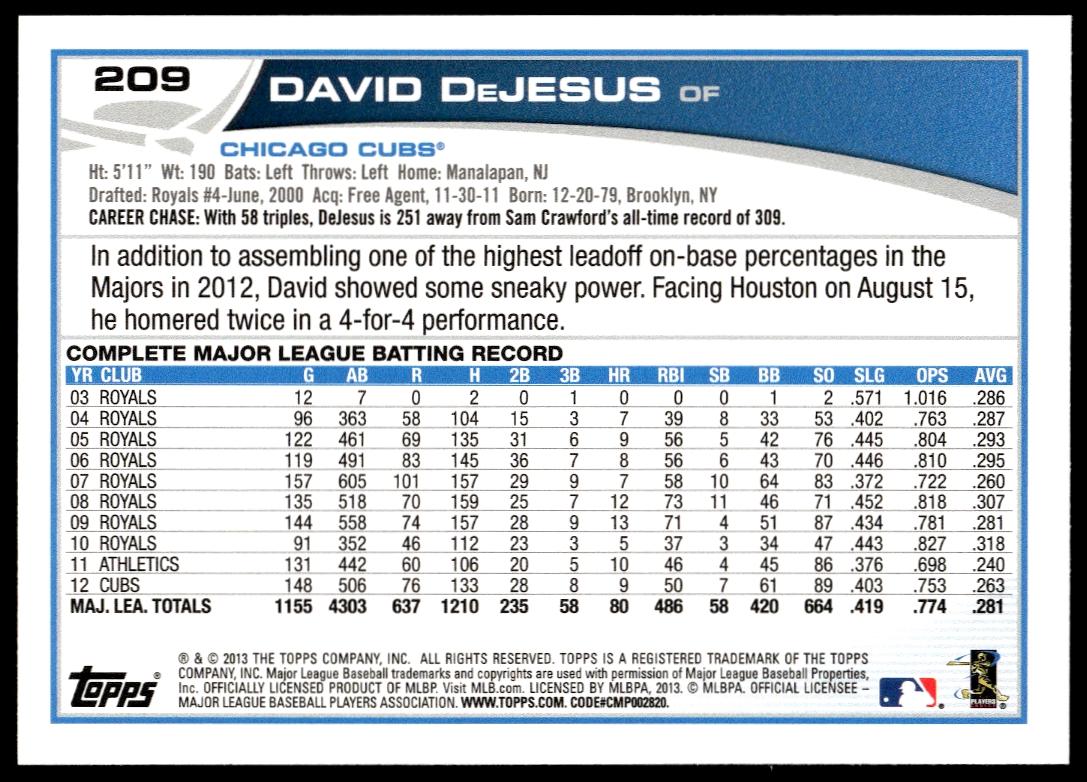 This BaseballΒ card, from 2013 is part of the Topps Series 1Β card set. David DeJesus is featured and has a card number of 209.