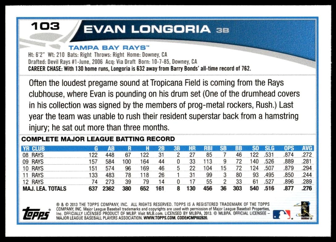 This Baseball card, from 2013 is part of the Topps Series 1 card set. Evan Longoria is featured and has a card number of 103.