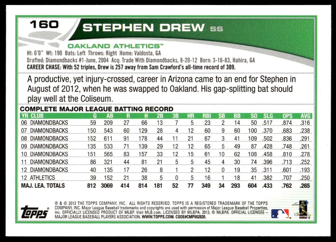This BaseballΒ card, from 2013 is part of the Topps Series 1Β card set. Stephen Drew is featured and has a card number of 160.