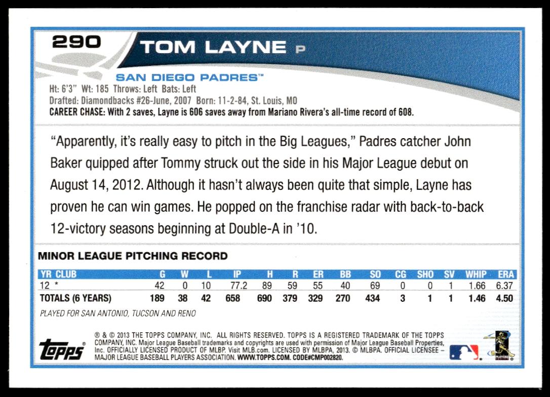 This Baseball card, from 2013 is part of the Topps Series 1 card set. Tom Layne is featured and has a card number of 290.