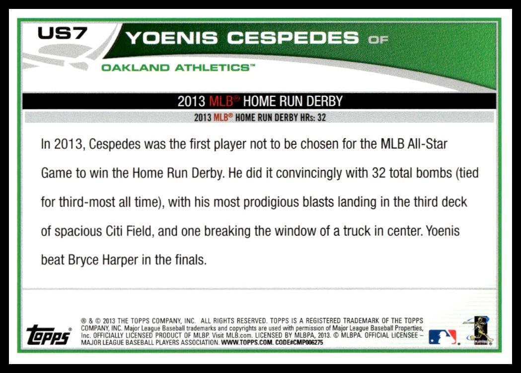 This BaseballΒ card, from 2013 is part of the Topps UpdateΒ card set. Yoenis Cespedes is featured and has a card number of US7.
