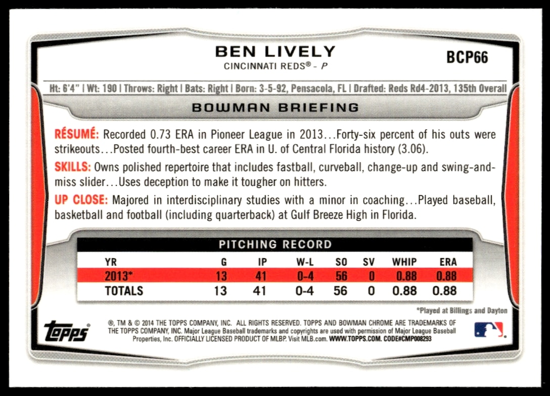 This Baseball card, from 2014 is part of the Bowman Chrome card set. Ben Lively is featured and has a card number of BCP66.