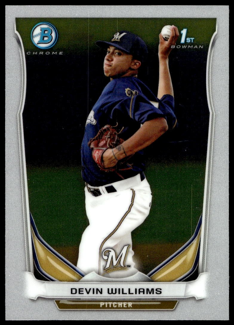 This Baseball card, from 2014 is part of the Bowman Chrome card set. Devin Williams is featured and has a card number of BCP7.