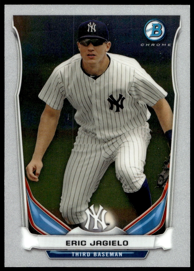 This Baseball card, from 2014 is part of the Bowman Chrome card set. Eric Jagielo is featured and has a card number of BCP9.