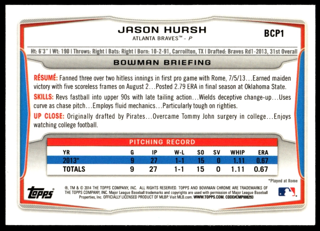 This Baseball card, from 2014 is part of the Bowman Chrome card set. Jason Hursh is featured and has a card number of BCP1.