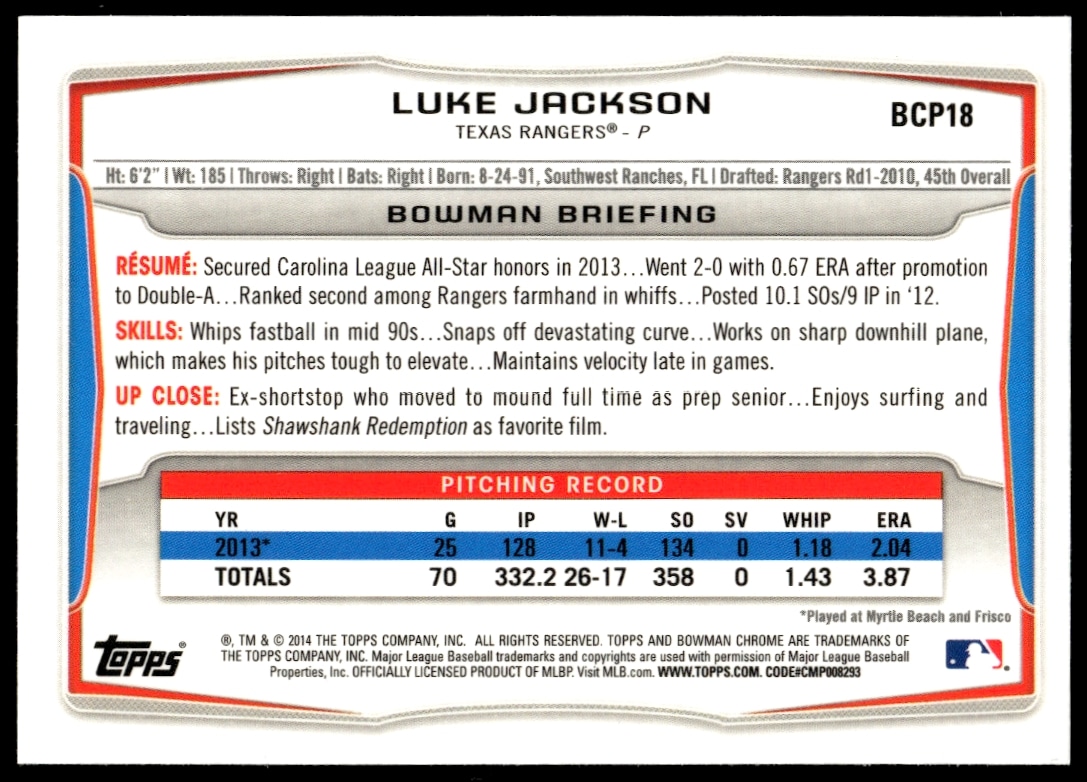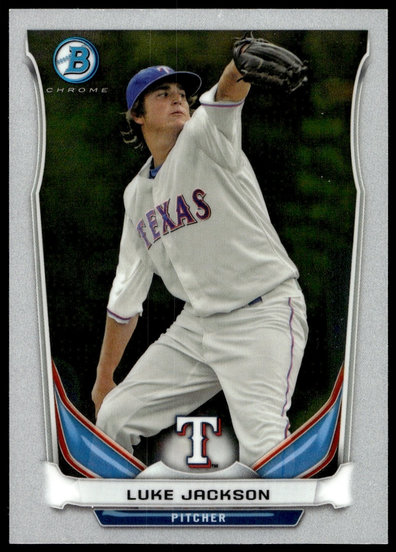 This Baseball card, from 2014 is part of the Bowman Chrome card set. Luke Jackson is featured and has a card number of BCP18.
