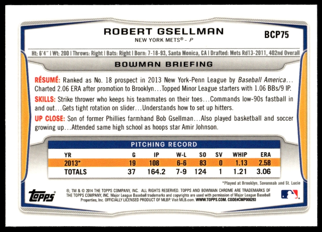 This Baseball card, from 2014 is part of the Bowman Chrome card set. Robert Gsellman is featured and has a card number of BCP75.