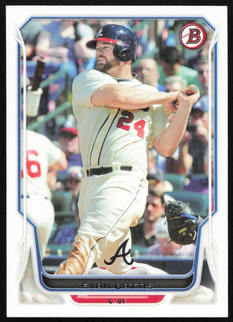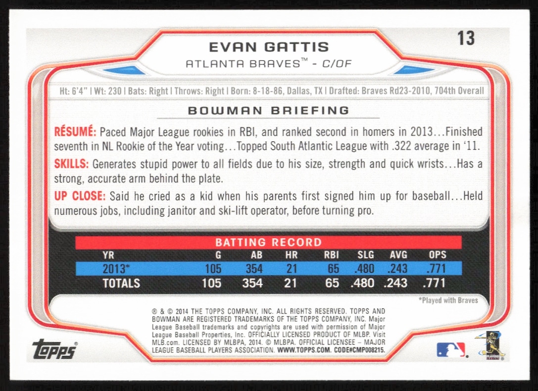 This Baseball card, from 2014 is part of the Bowman card set. Evan Gattis is featured and has a card number of 13.