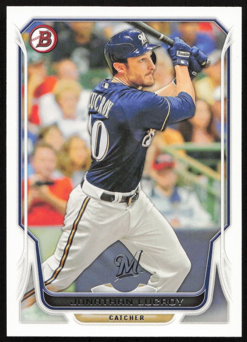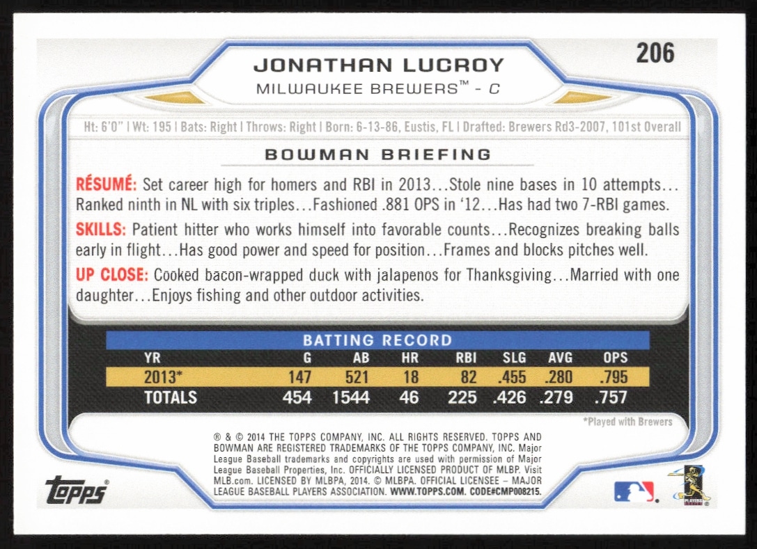 This Baseball card, from 2014 is part of the Bowman card set. Jonathan Lucroy is featured and has a card number of 206.