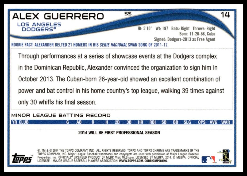 This Baseball card, from 2014 is part of the Topps Chrome card set. Alex Guerrero is featured and has a card number of 14.
