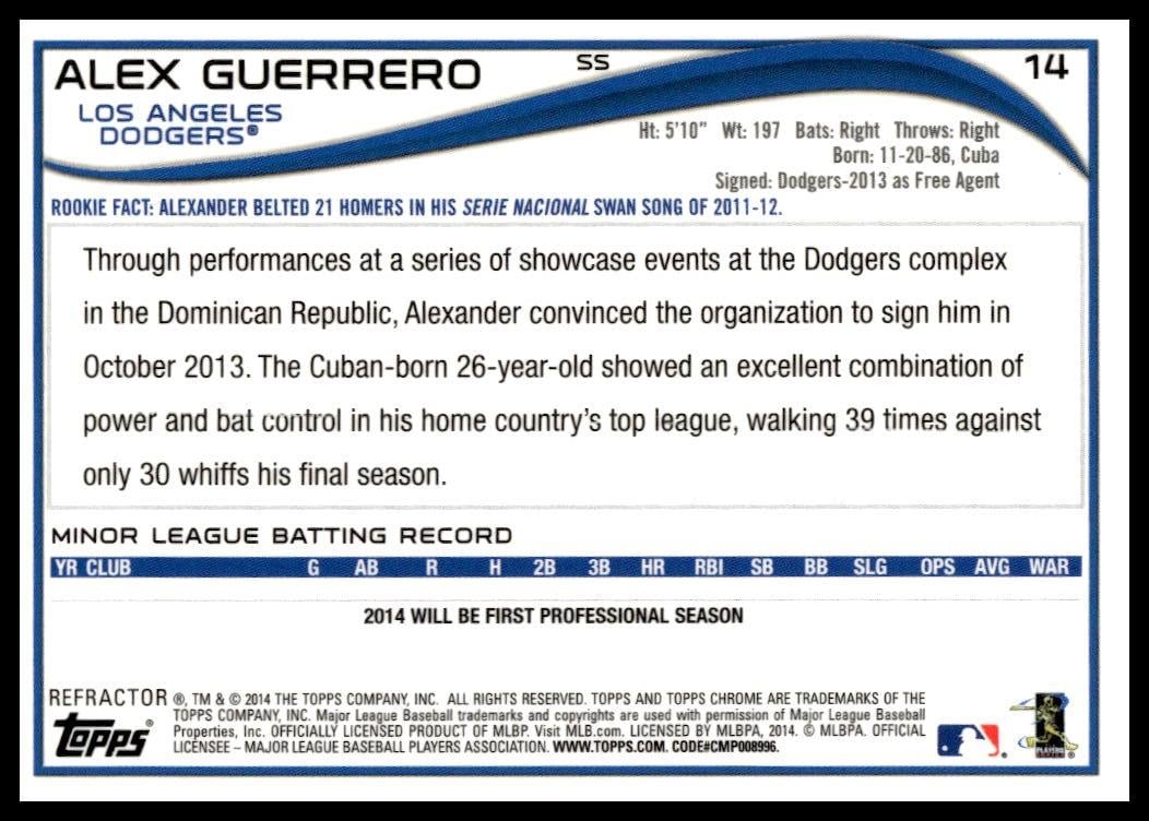 This BaseballΒ card, from 2014 is part of the Topps ChromeΒ card set. Alex Guerrero is featured and has a card number of 14.