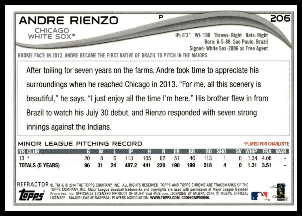 This BaseballΒ card, from 2014 is part of the Topps ChromeΒ card set. Andre Rienzo is featured and has a card number of 206.