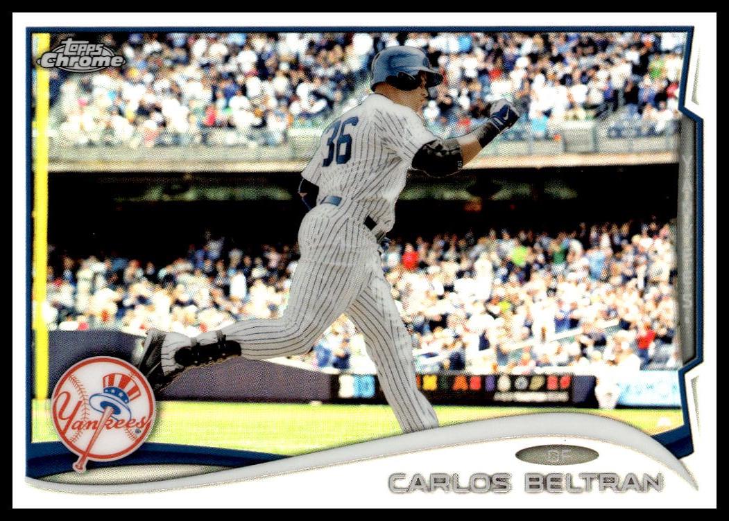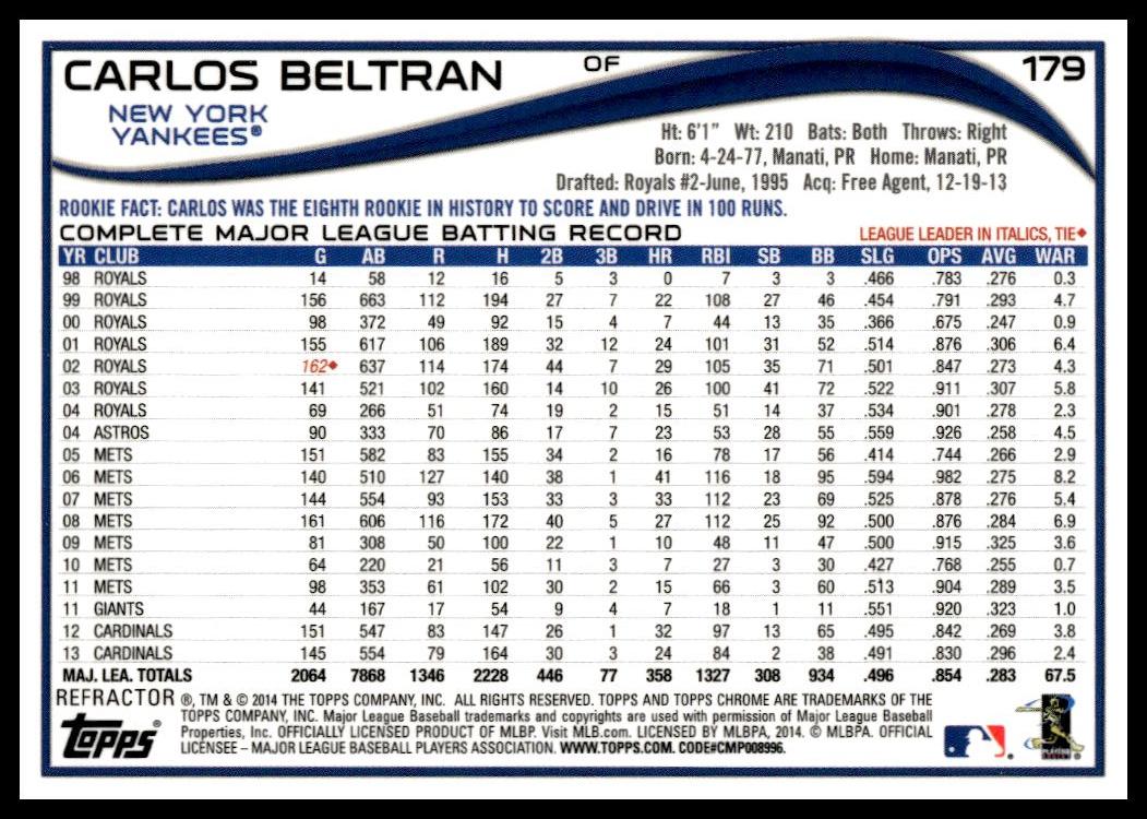 This BaseballΒ card, from 2014 is part of the Topps ChromeΒ card set. Carlos Beltran is featured and has a card number of 179.