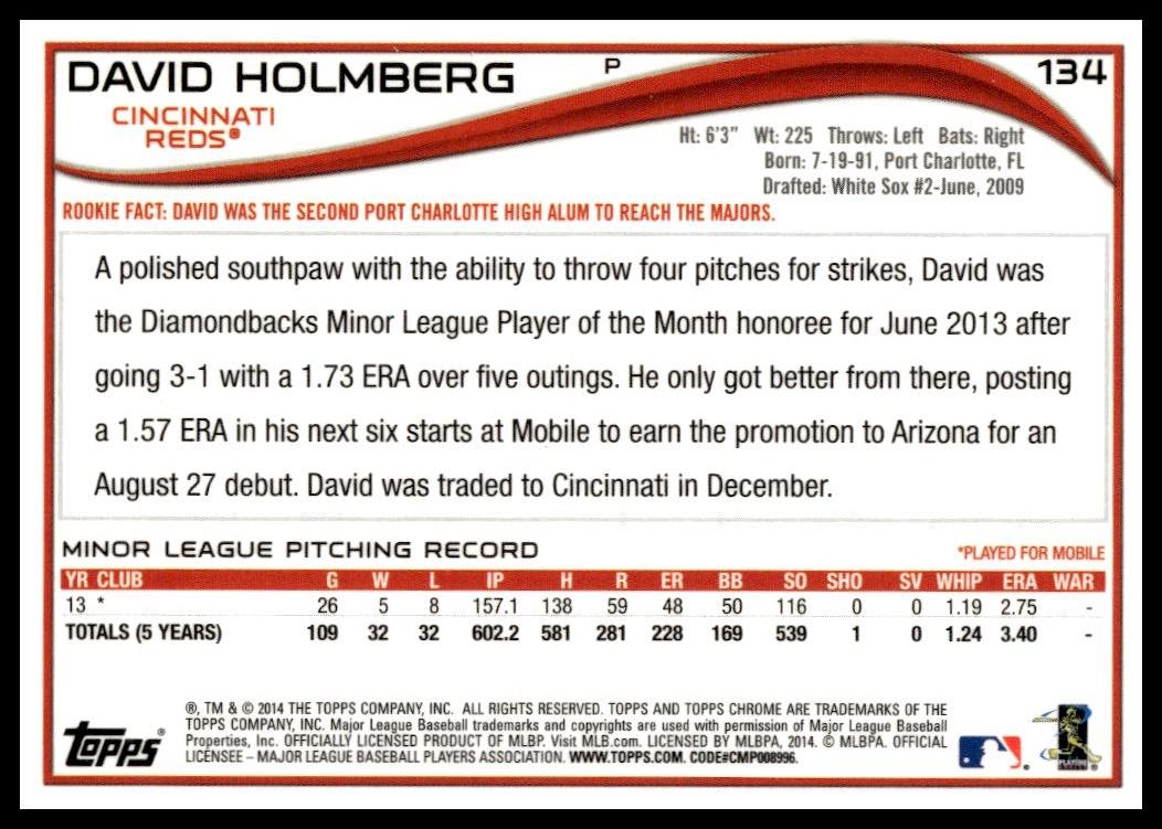 This BaseballΒ card, from 2014 is part of the Topps ChromeΒ card set. David Holmberg is featured and has a card number of 134.