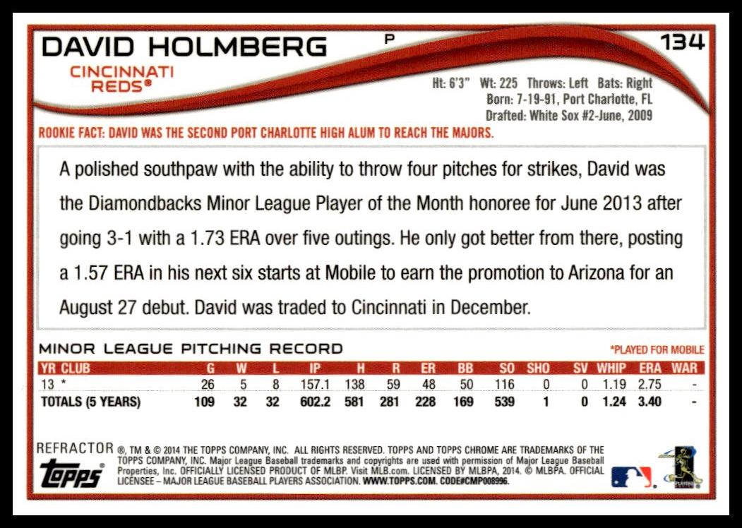 This BaseballΒ card, from 2014 is part of the Topps ChromeΒ card set. David Holmberg is featured and has a card number of 134.