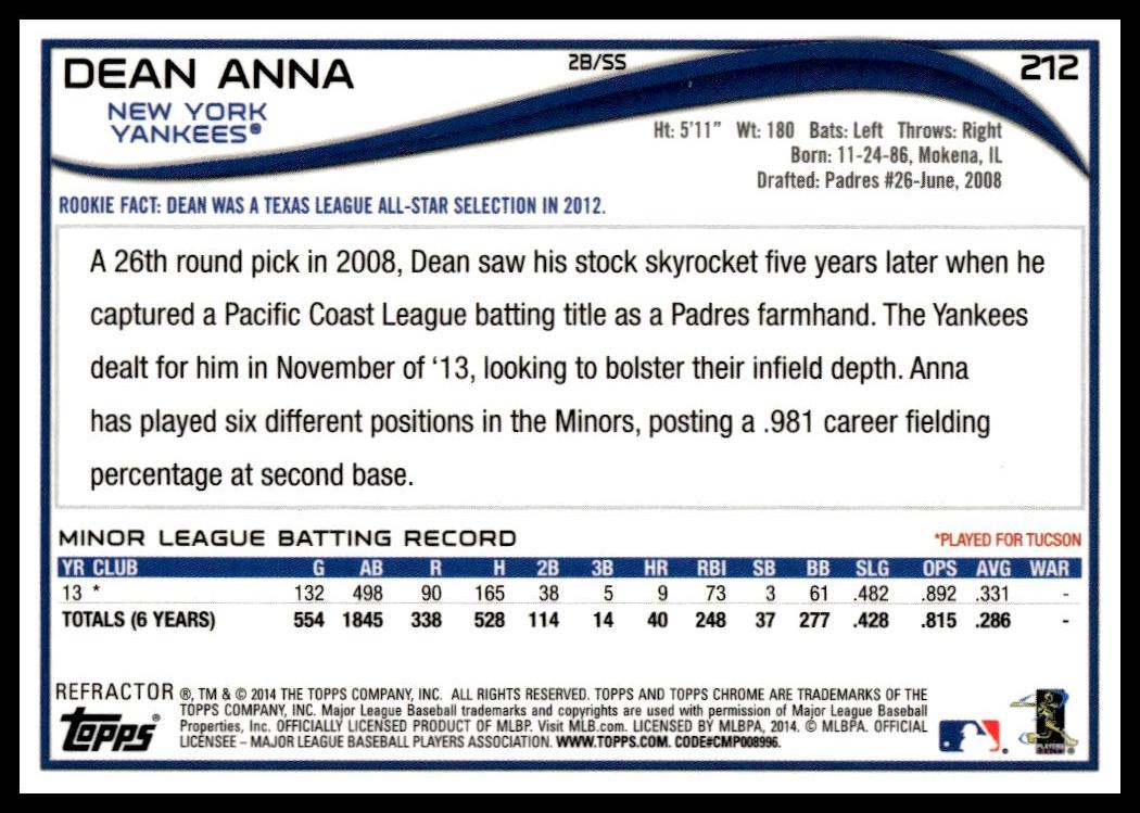 This BaseballΒ card, from 2014 is part of the Topps ChromeΒ card set. Dean Anna is featured and has a card number of 212.