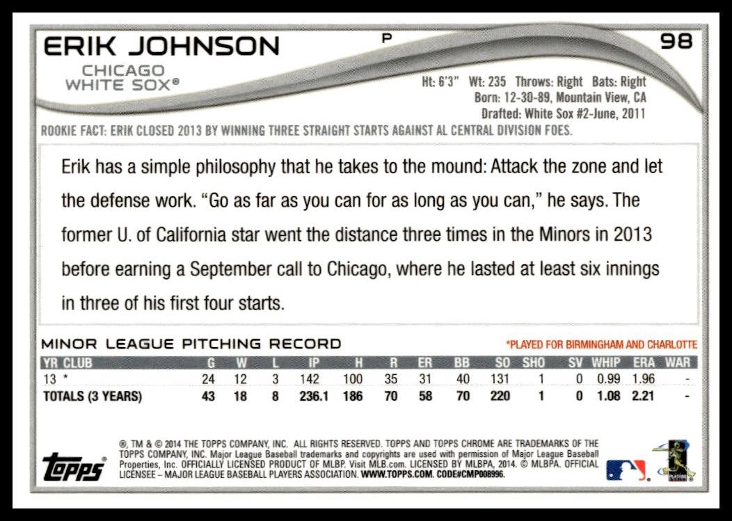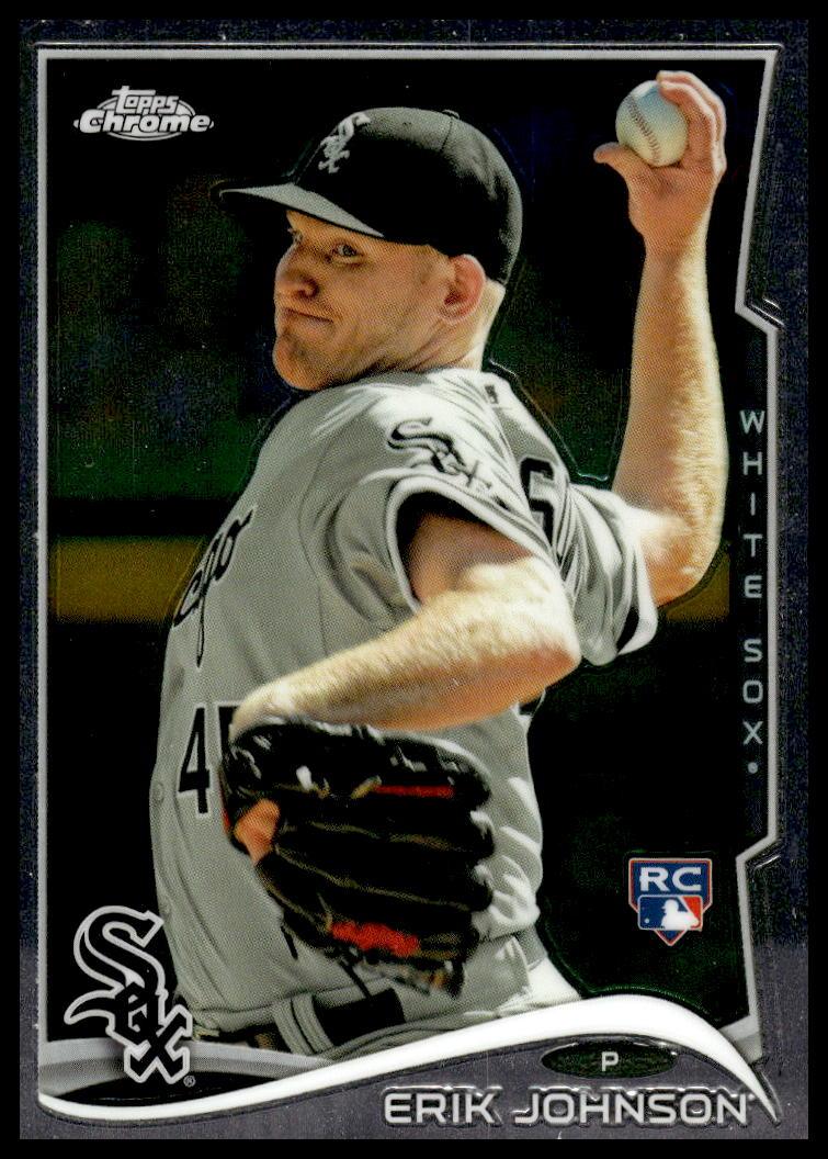 This BaseballΒ card, from 2014 is part of the Topps ChromeΒ card set. Erik Johnson is featured and has a card number of 98.
