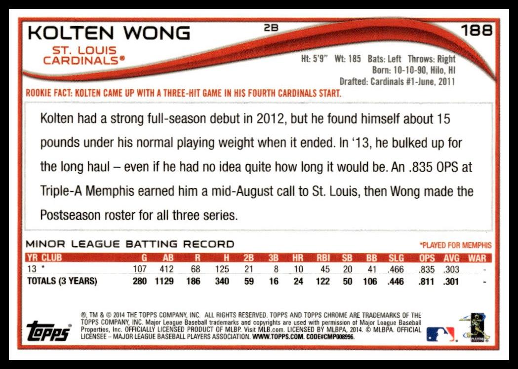 This BaseballΒ card, from 2014 is part of the Topps ChromeΒ card set. Kolten Wong is featured and has a card number of 188.