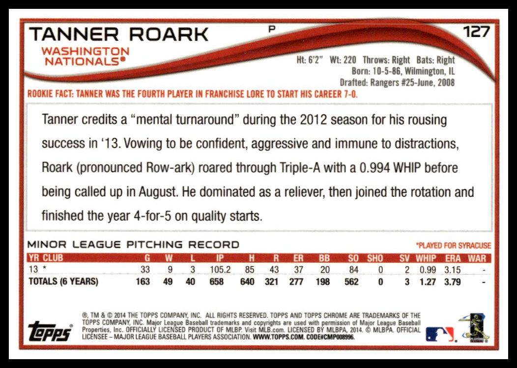 This BaseballΒ card, from 2014 is part of the Topps ChromeΒ card set. Tanner Roark is featured and has a card number of 127.