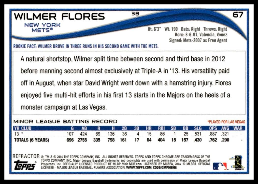 This BaseballΒ card, from 2014 is part of the Topps ChromeΒ card set. Wilmer Flores is featured and has a card number of 67.