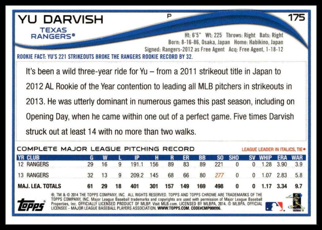 This Baseball card, from 2014 is part of the Topps Chrome card set. Yu Darvish is featured and has a card number of 175.