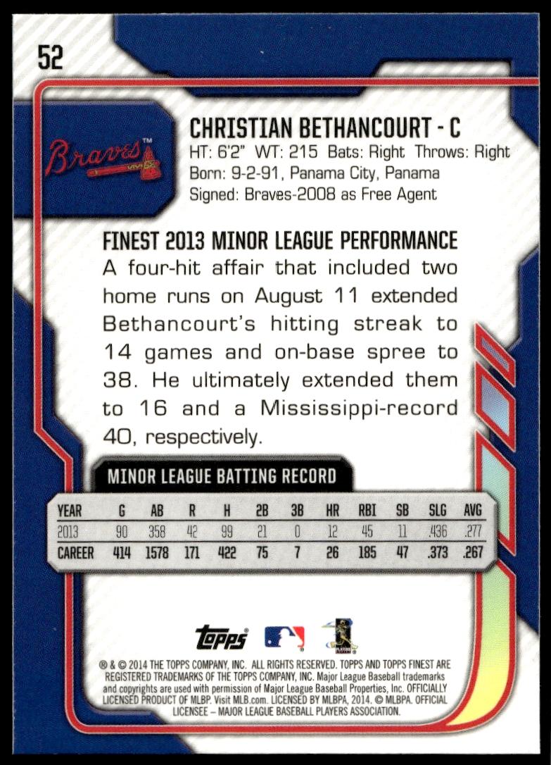 This BaseballΒ card, from 2014 is part of the Topps FinestΒ card set. Christian Bethancourt is featured and has a card number of 52.