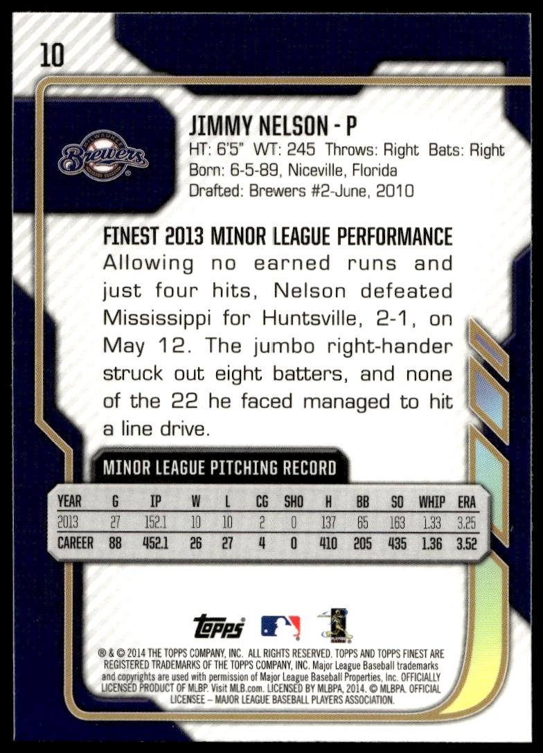 This BaseballΒ card, from 2014 is part of the Topps FinestΒ card set. Jimmy Nelson is featured and has a card number of 10.