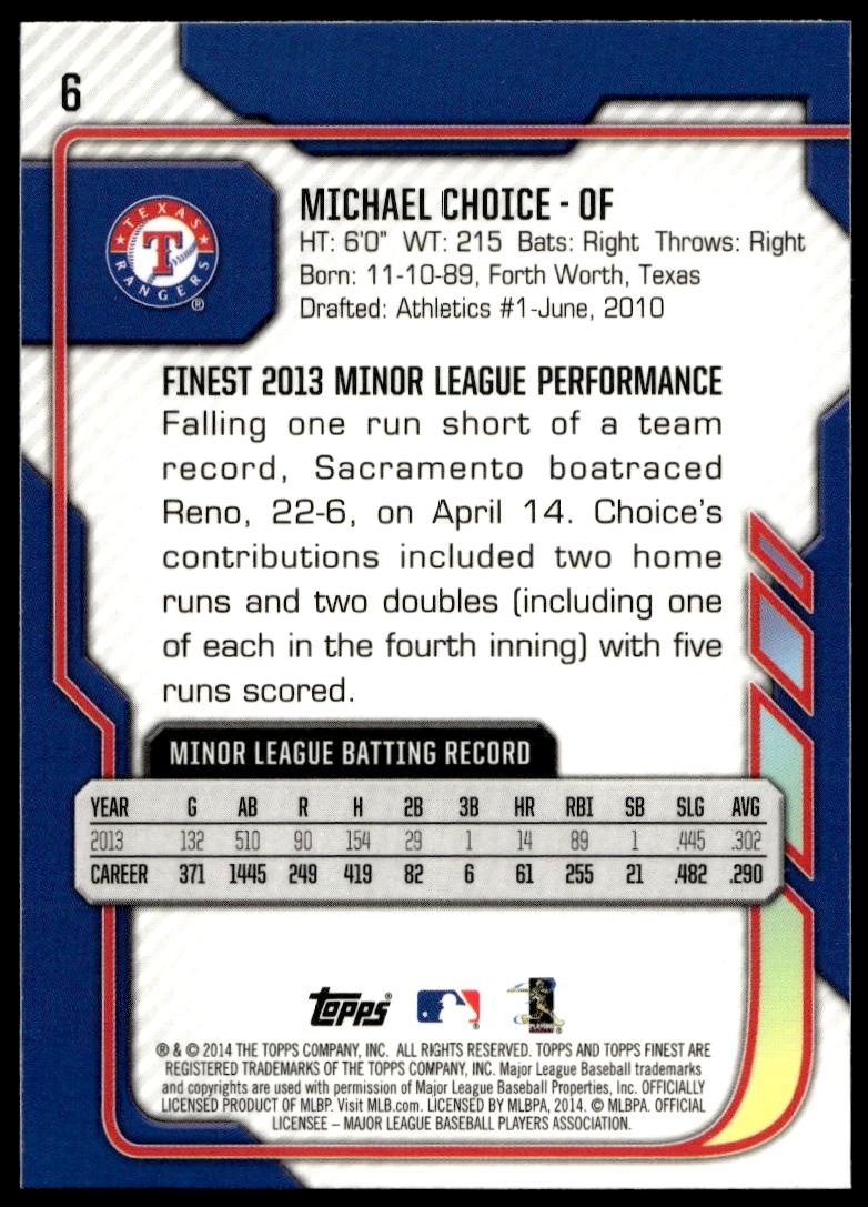 This BaseballΒ card, from 2014 is part of the Topps FinestΒ card set. Michael Choice is featured and has a card number of 6.
