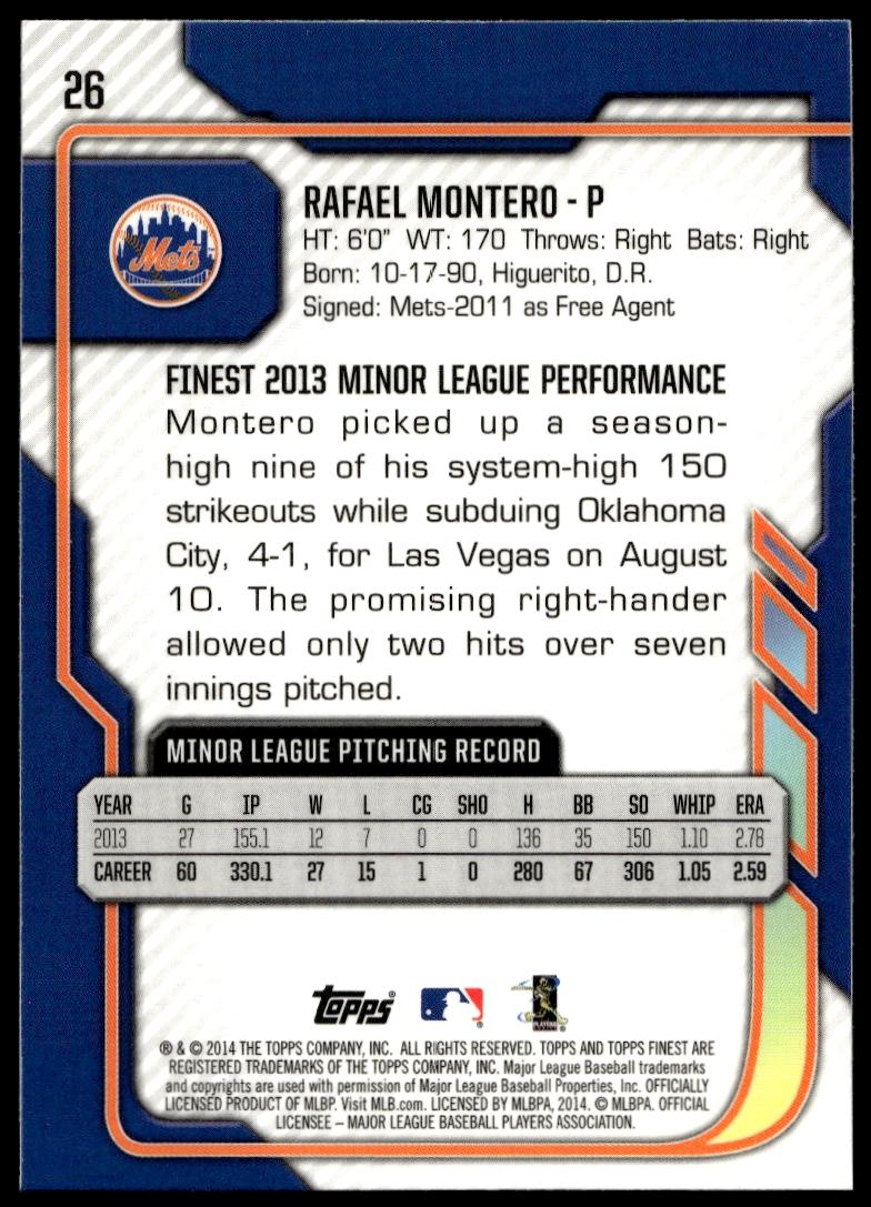 This BaseballΒ card, from 2014 is part of the Topps FinestΒ card set. Rafael Montero is featured and has a card number of 26.