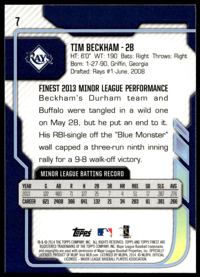 This Baseball card, from 2014 is part of the Topps Finest card set. Tim Beckham is featured and has a card number of 7.