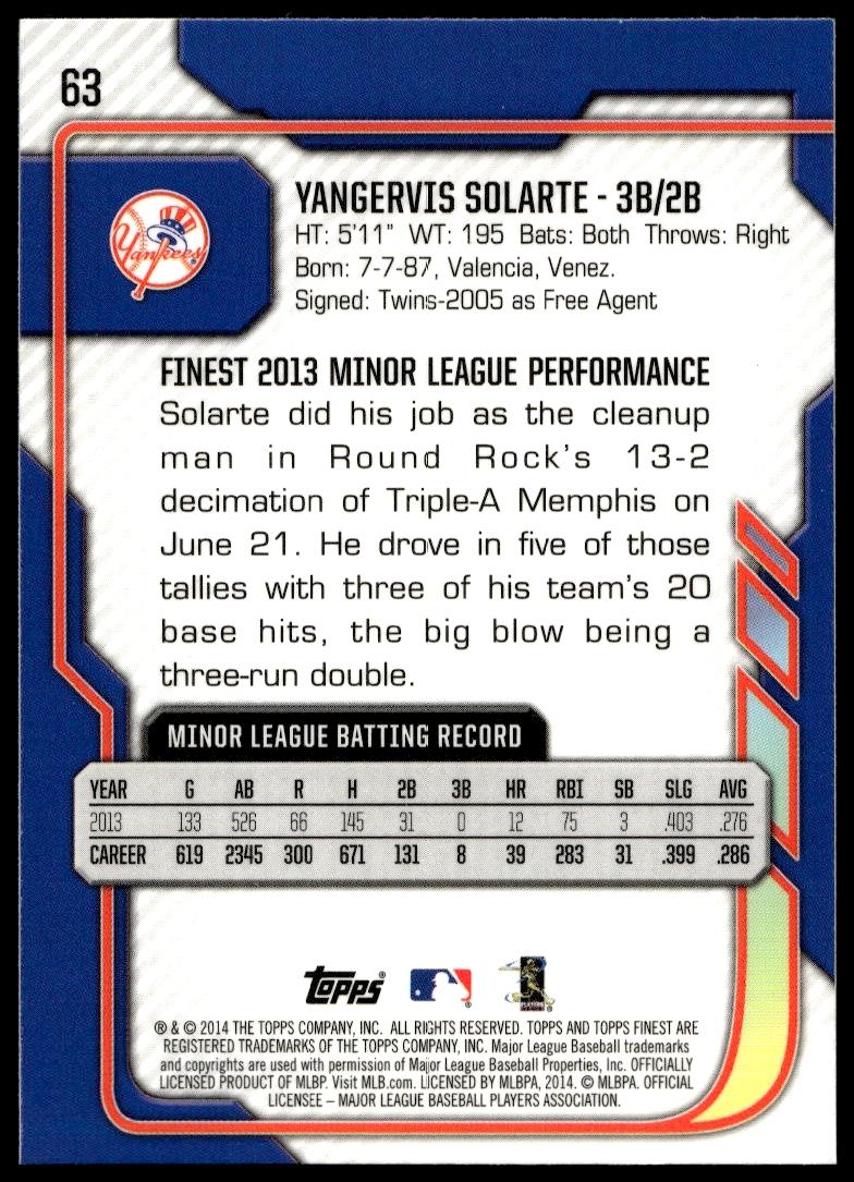 This BaseballΒ card, from 2014 is part of the Topps FinestΒ card set. Yangervis Solarte is featured and has a card number of 63.