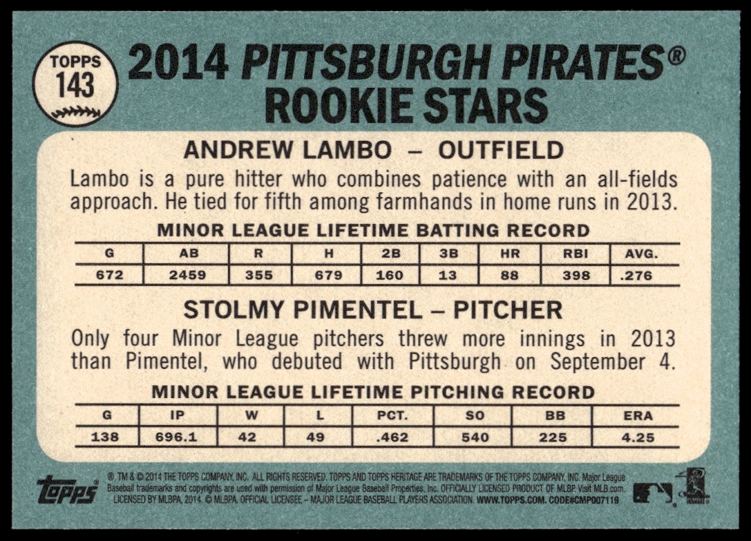 This BaseballΒ card, from 2014 is part of the Topps HeritageΒ card set. Andrew Lambo / Stolmy Pimentel is featured and has a card number of 143.