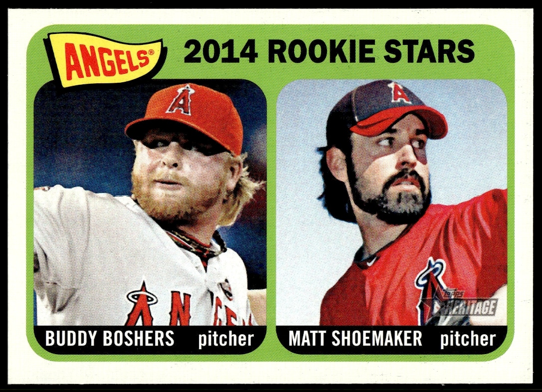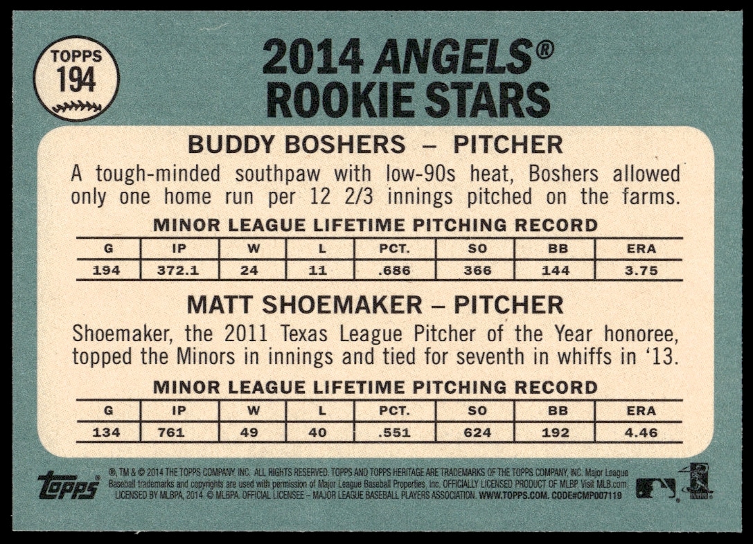 This BaseballΒ card, from 2014 is part of the Topps HeritageΒ card set. Buddy Boshers / Matt Shoemaker is featured and has a card number of 194.