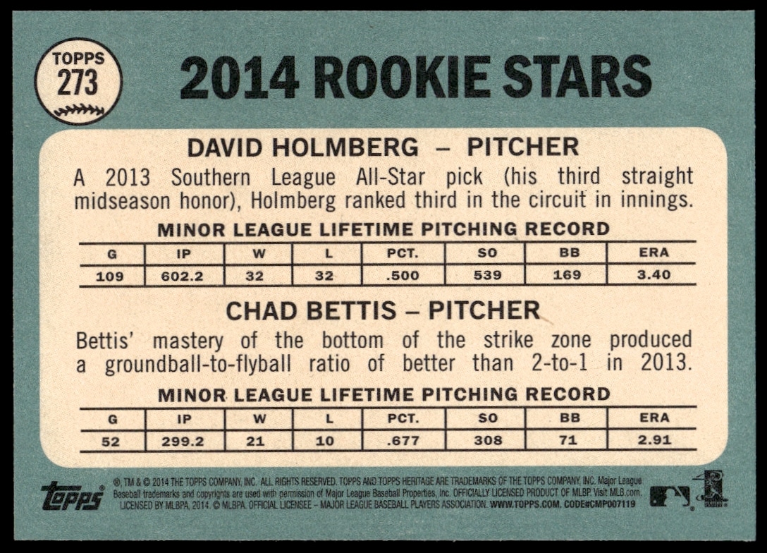 This BaseballΒ card, from 2014 is part of the Topps HeritageΒ card set. Chad Bettis / David Holmberg is featured and has a card number of 273.