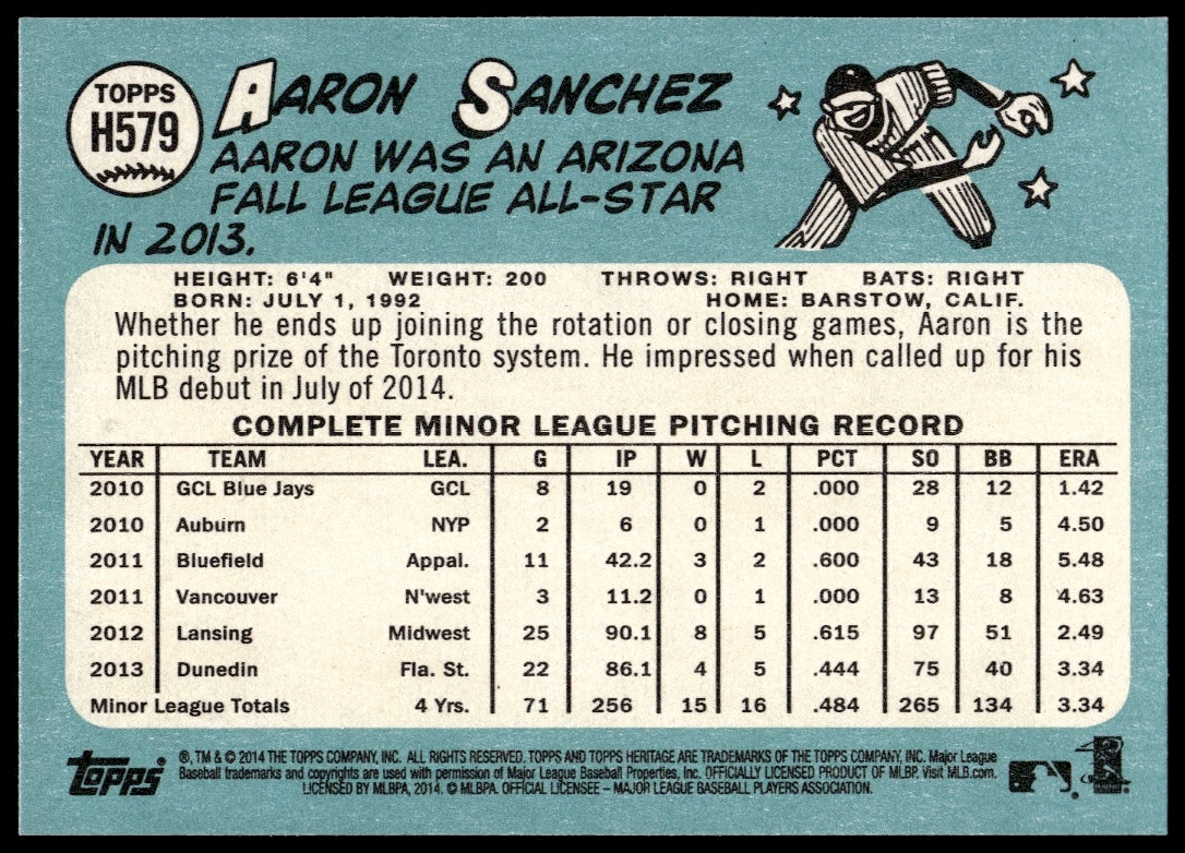 This BaseballΒ card, from 2014 is part of the Topps Heritage High CardΒ card set. Aaron Sanchez is featured and has a card number of H579.