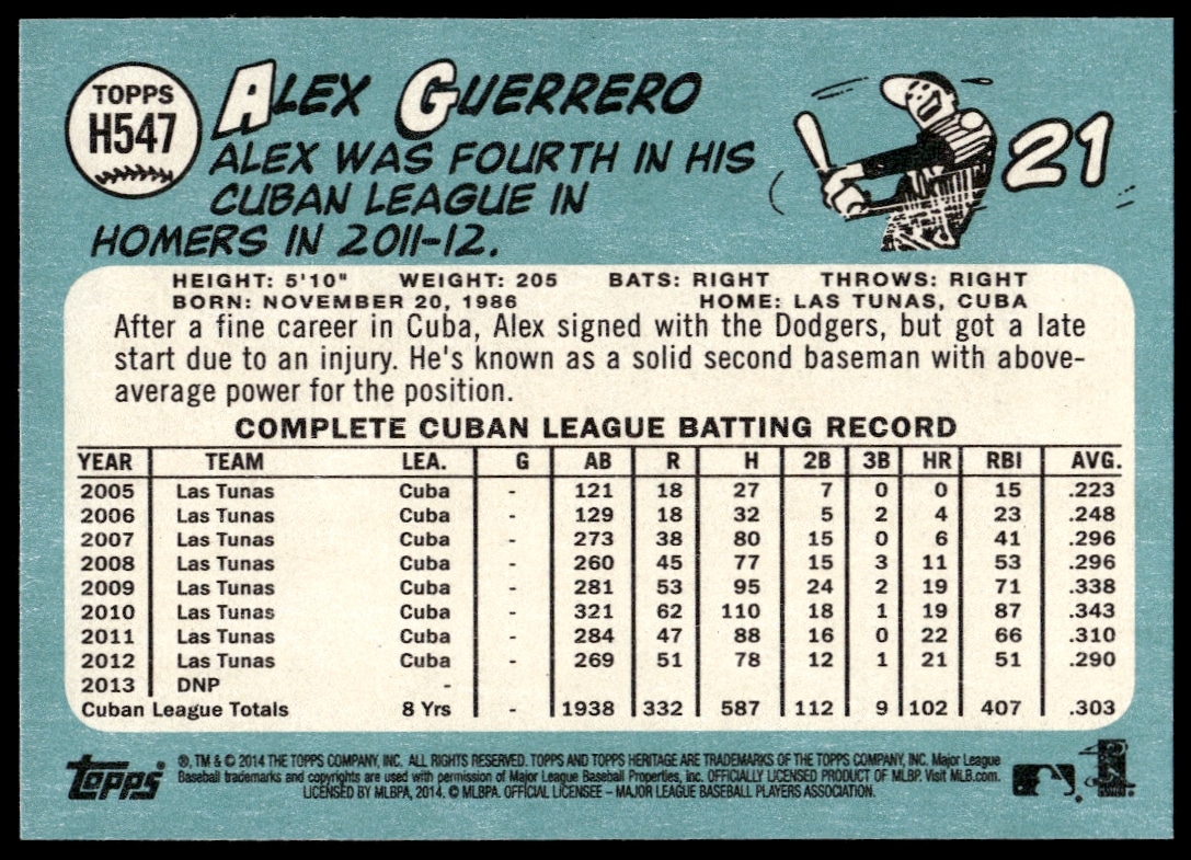 This BaseballΒ card, from 2014 is part of the Topps Heritage High CardΒ card set. Alex Guerrero is featured and has a card number of H547.