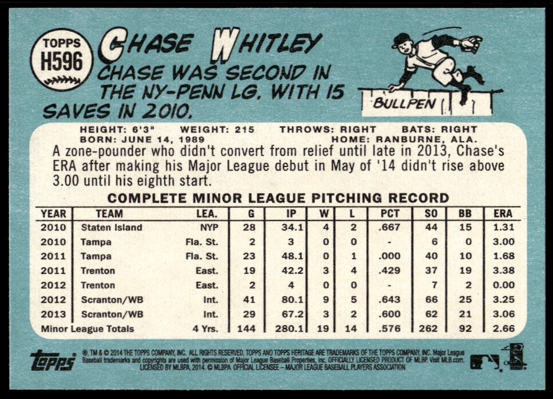 This BaseballΒ card, from 2014 is part of the Topps Heritage High CardΒ card set. Chase Whitley is featured and has a card number of H596.