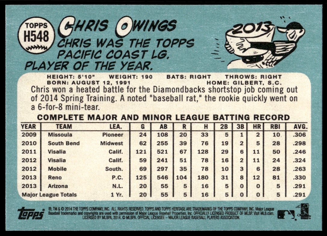This BaseballΒ card, from 2014 is part of the Topps Heritage High CardΒ card set. Chris Owings is featured and has a card number of H548.