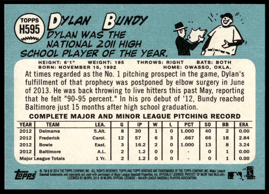 This BaseballΒ card, from 2014 is part of the Topps Heritage High CardΒ card set. Dylan Bundy is featured and has a card number of H595.