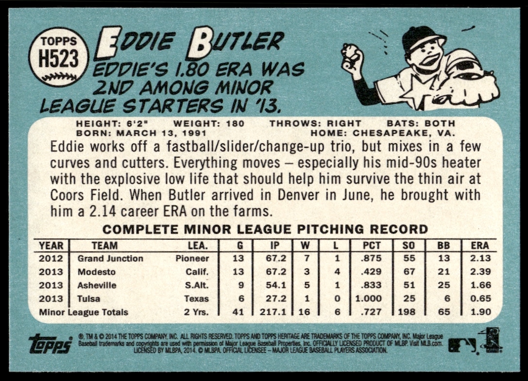 This BaseballΒ card, from 2014 is part of the Topps Heritage High CardΒ card set. Eddie Butler is featured and has a card number of H523.