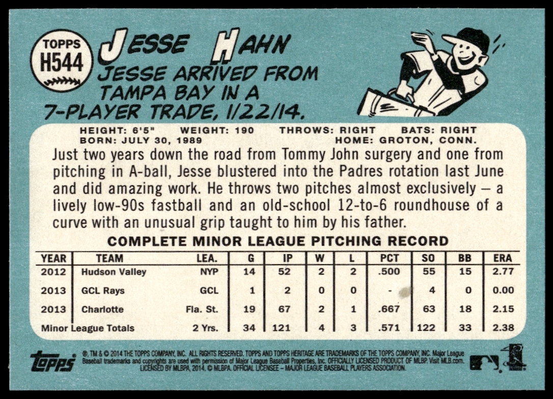 This BaseballΒ card, from 2014 is part of the Topps Heritage High CardΒ card set. Jesse Hahn is featured and has a card number of H544.