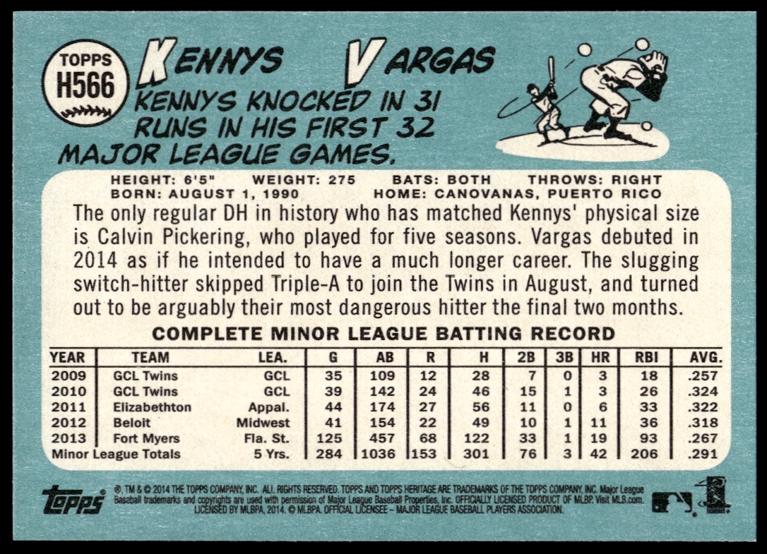 This BaseballΒ card, from 2014 is part of the Topps Heritage High CardΒ card set. Kennys Vargas is featured and has a card number of H566.