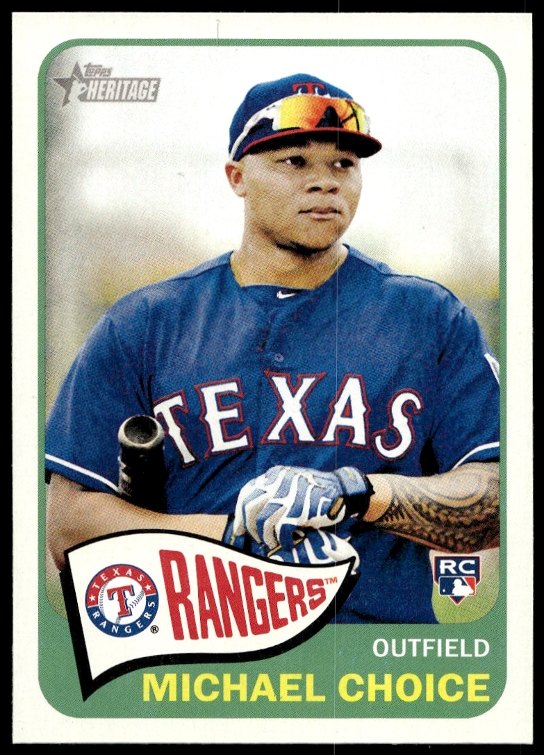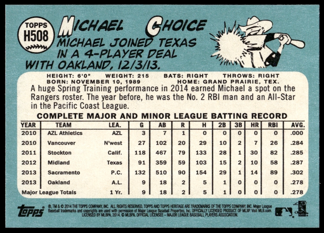 This BaseballΒ card, from 2014 is part of the Topps Heritage High CardΒ card set. Michael Choice is featured and has a card number of H508.