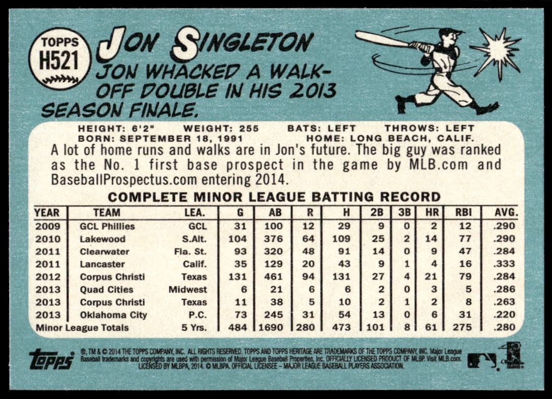 This Baseball card, from 2014 is part of the Topps Heritage High Number card set. Jon Singleton is featured and has a card number of H521.